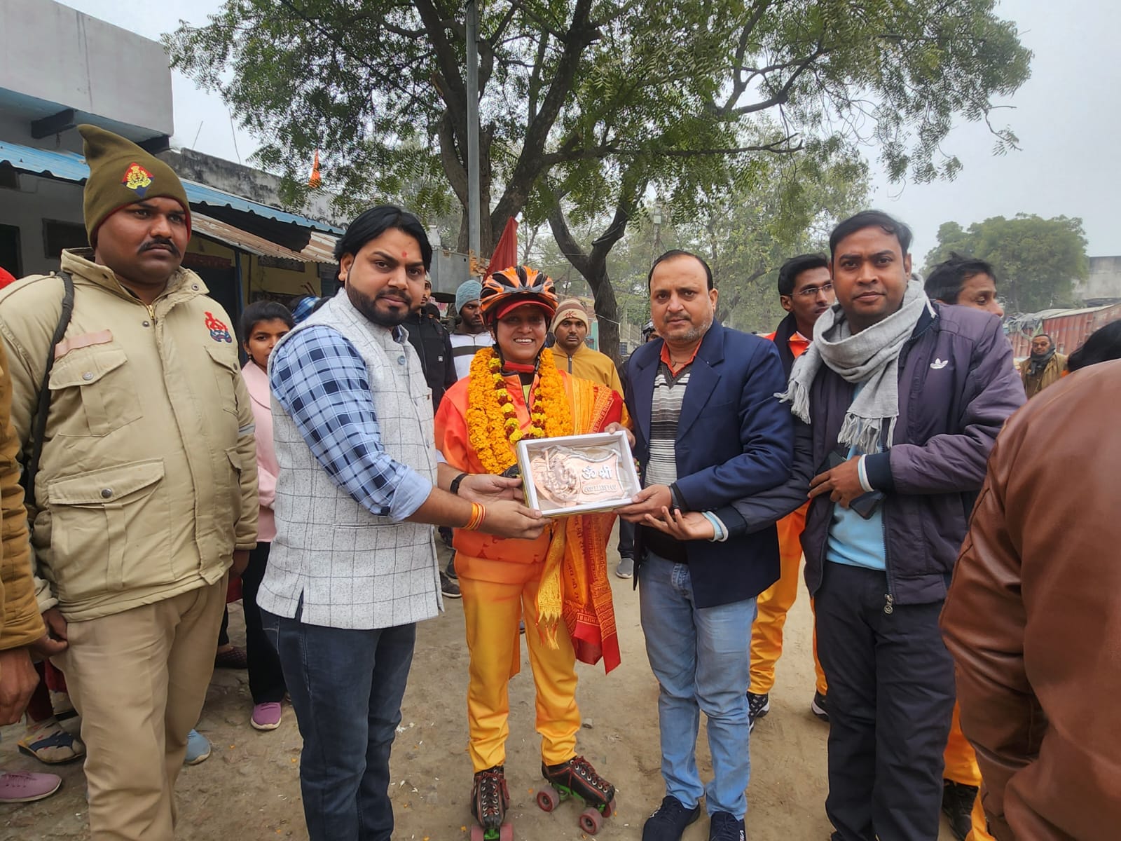 जलालपुर—क्षेत्र के त्रिलोचन महादेव बाजार में फिल्म अभिनेता/समाजसेवी चन्दन सेठ के नेतृत्व में सैकड़ों बाजार वासियों एवं क्षेत्र वासियों ने श्रीराम के जयकारे व बैंड बाजे के साथ काशी प्रांत की महिला प्रमुख,कत्थक नृत्यांगना व स्केटर सोनी चौरसिया का जोरदार स्वागत किया।सोनी चौरसिया ने बताया कि श्रीराम मंदिर प्राण प्रतिष्ठा कार्यक्रम में शामिल होने के लिए आमंत्रित किया गया है।बताते चले की सोनी आज वाराणसी से प्रात:8:30 बजे श्रीकाशी विश्वनाथ धाम का दर्शन-पूजन कर स्केटिंग करते हुए अयोध्या के लिए रवाना हुयी हैं।सोनी ने बताया कि वह अपनी स्केटिंग गुरू राजेश डोगरा व टीम के चार सदस्यों के साथ निकली हैं।यात्रा यहां से जौनपुर,बदलापुर,सुल्तानपुर होते हुए 20 जनवरी को अयोध्या धाम पहुंचेगी।सोनी ने बताया उन्हे संघ के काशी प्रांत के संपर्क प्रमुख दीनदयाल पांडेय और अखिल भारतीय ग्राहक पंचायत काशी प्रांत के प्रांत संगठन मंत्री अरविंद ने अयोध्या के लिए आमंत्रण पत्र सौंपा।चन्दन सेठ ने इस दौरान सोनी चौरसिया को पुष्प गुच्छ व रामनामी अंग वस्त्र भेंट कर मंगलमय यात्रा की कामना किया।इस दौरान विनय वर्मा,पंकज सिंह,साधना मिश्रा,गोल्डी सिंह,रानी यादव,मान्सी सिंह,संगम जायसवाल,रामचन्दर सेठ,चन्द्रेज़ दुबे,सुजीत चौरसिया,राजा गिरि समेत सैकड़ो लोग उपस्थित रहे।