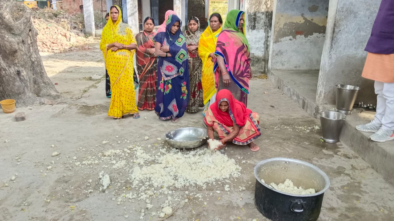 आदर्श प्राथमिक विद्यालय मड़ियाहूं प्रथम में मिड डे मील योजना का भोजन बनाने के लिए अनुसूचित जाति के पासी समाज की महिला सन्तरा देवी रसोइया रखी गई है। मंगलवार की सुबह दो सौ बच्चों के लिए मेन्यू के हिसाब से चावल एवं दाल बनाया गया था।