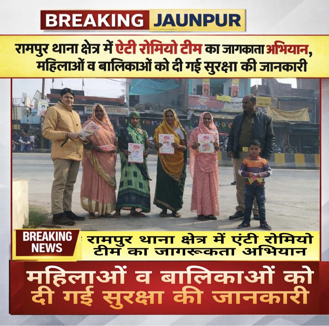 जनपद जौनपुर के थाना रामपुर क्षेत्र में एंटी रोमियो टीम द्वारा मिशन शक्ति फेज–5 के अंतर्गत व्यापक जन-जागरूकता अभियान चलाया गया। इस दौरान टीम ने कस्बा, बाजार, विद्यालयों के आसपास तथा भीड़भाड़ वाले स्थानों पर भ्रमण कर महिलाओं एवं बालिकाओं से संवाद किया और उन्हें शासन की महिला सुरक्षा योजनाओं व अधिकारों की जानकारी दी।