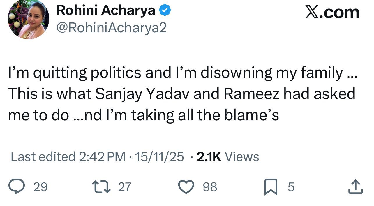 रोहिणी ने अपने पोस्ट में लिखा, “मैं राजनीति छोड़ रही हूँ और अपने परिवार से नाता तोड़ रही हूँ। संजय यादव और रमीज़ ने मुझसे यही करने को कहा था और मैं सारा दोष अपने ऊपर ले रही हूं।”